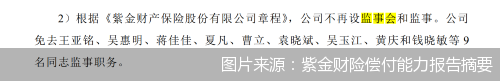 北京商报讯(记者李秀梅)8月7日,北京商报记者注意到,近期紫金财产保险股份有限公司(以下简称“紫金财险”)发布的偿付能力报告摘要显示,紫金财险不再设监事会。该公司免去了王亚铭、吴惠明、蒋佳佳、夏凡、曹立、袁晓斌、吴玉江、黄庆和钱晓敏监事职务。